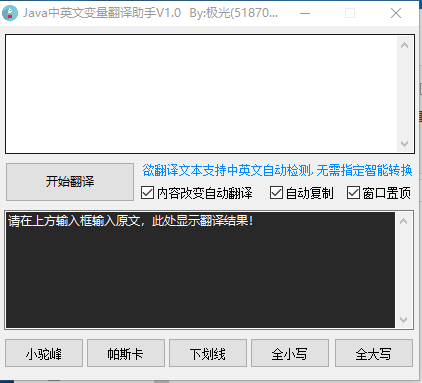 Java中英文变量翻译助手绿色版是一款非常好用的Java翻译小工具,Java中英文变量翻译助手绿色版页面简洁友好,功能强大,只需要在框中输入复制原文,即可显示翻译结果,软件还支持中英文自动检测。对于做编程开发的朋友是一个很好的帮手。