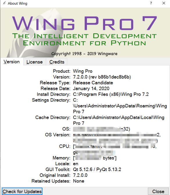 最初安装后,wing ide 7可以自行更新到新版本,而无需下载安装程序。可以从“ 关于”框中回滚到旧版本,并且可以生成更新以在无法访问Internet的主机上使用。这个新系统将允许我们更频繁地发布次要功能和错误修复。安装程序仍将定期生成,但只有更新管理器才能提供更多版本。