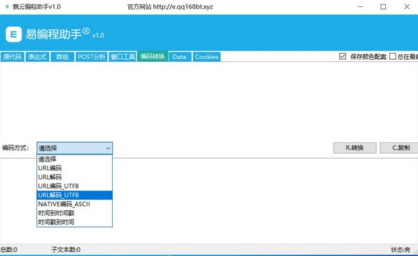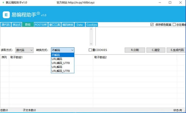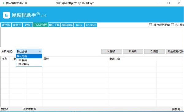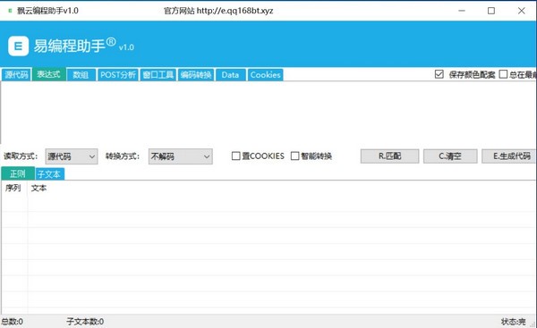 飘云编程助手官方版是一款简单易用的编程辅助工具,飘云编程助手官方版分布为正则表达式、数组分割、POST分析、窗口工具、编码转换,可快速的使用正则表达式匹配,网页数据分割,POST数据分析,窗口数据采集,编码转换等。可以模拟分析正则所有类型表达式,可调用源代码、URL两种数据来源,可进行编码解码数据,自带(.*?)转换功能,具有匹配文本及匹配子文本功能显示,可直接生成编程代码。