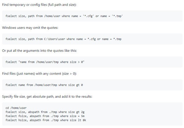 fselect最新版是一款十分专业且高端实用的文件查找工具,fselect最新版可以让你用类似SQL的查询方式查找文件,虽然它并不倾向于完全取代传统的find和ls,支持复杂的查询,还有汇总、日期和其他功能!