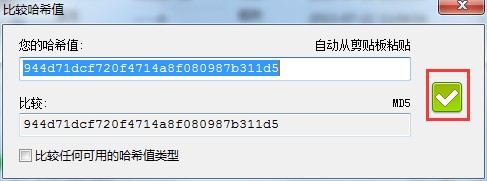 如果要对比文件MD5值的话,先把要对比的MD5值复制进剪贴板中,然后点击对比按钮,即可看到结果
