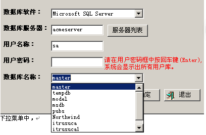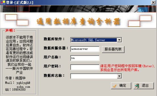 二、输入用户名称和密码,在密码处按“Enter”回车按钮,系统会自动把你连计算机中的所有数据库增加到数据库名称下拉菜单中,选择一个按确定按钮进入。