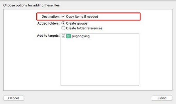 将PgySDK.framework拖动到你的Xcode工程里,并勾选Copy items if needed。