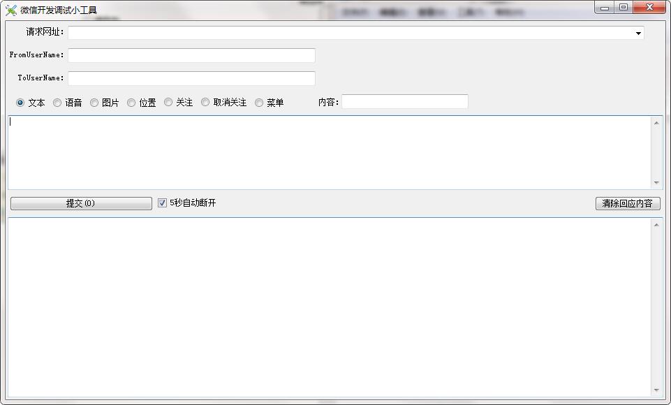 6、5秒自动断开复选框:模拟微信服务器的计时机制,一般请求都不会超过5秒,但有时确实会出现超过5秒的请求,我自己就出现过,有些特定的操作会发生这种情况,因此这个也算是有用的。
