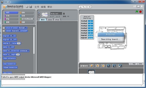 在S4A中,Arduino板由一种特殊的精灵来表示。Arduino sprite会自动找到连接板的usb端口。