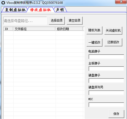 Vbox复制修改程序最新版是一个美观实用、轻量快速的Vbox虚拟机复制与修改工具,Vbox复制修改程序最新版主要功能是修改虚拟机的内部硬件系统,能够批量复制,批量修改,效果非常好。还可以修改指定Vbox虚拟机的电脑品牌、主板品牌、硬盘品牌、硬盘序列号以及MAC地址,并支持一键还原修改功能。