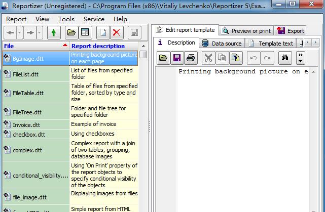 Reportizer 是一款数据报表工具,通过DBE或ADO(ODBC)和DB,DBF,TXT,CSV,ASC等数据源连接,从而可以生成,修改,打印数据报表。