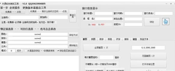 可以在绑定窗口下或者未绑的时候使用。首先,点"Rect"创建一个窗口,然后可以点"DrawText"在窗口上面显示文字,文字的内容为右侧”文字:"后面框内的内容。颜色指文字颜色,颜色2指