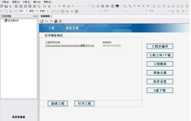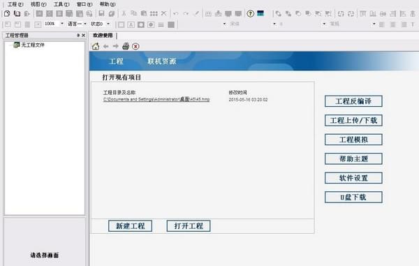 打开软件,主画面会显示“欢迎使用”界面。在工程画面中,右侧有六个选项:工程反编译、工程上传/下载、工程模拟、帮助主题、软件设置、U盘下载。详细说明如下: