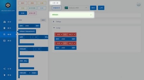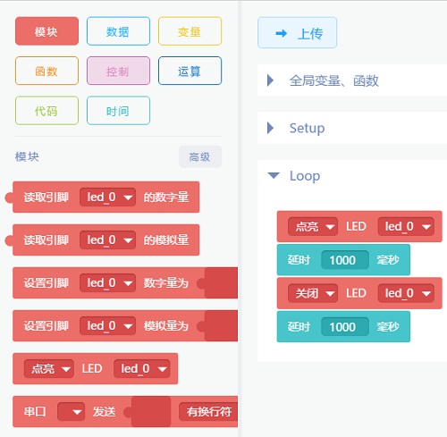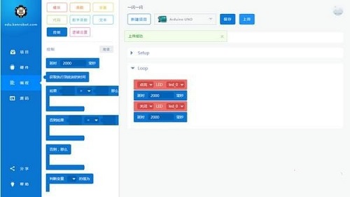 左侧单击“编程”进入程序编写界面。从左侧库中选择 “点亮LED”,并拖入画布中。