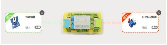 在“模块拼接”界面,将“传感器”栏的电子模块拖拉进“输入模块”,将“执行器”栏下的电子模块拖拉进“输出模块”。例如,使用joint主控、“按键模块”和“红色LED灯珠”。