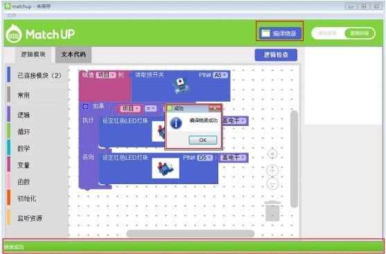 在“逻辑拼接”界面,将电子模块通过左边的“逻辑模块”中找到合适的逻辑语句拼接起来。如下图,想要实现的功能是:当检测到按键开关被按下,则点亮红色LED灯珠;若按键开关未被按下,则不点亮红色LED灯珠。