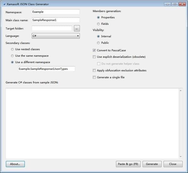 支持以下类型:类型化数组、类型化对象、整数、浮点数、布尔值、字符串和可空类型。可以指定是生成基于属性的类还是基于字段的POCO类,以及它们的可见性。类名和数组字段自动被多元化/单数化,您可以选择是保留原来的字母大小写还是使用PascalCase。
