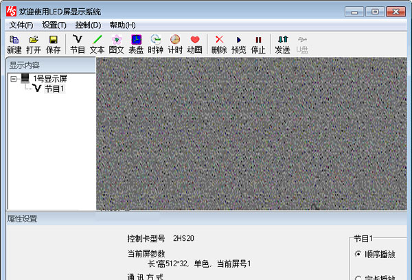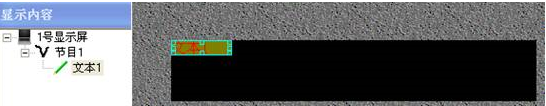 3、进入LED显示屏控制卡驱主界面后,左侧有一个默认的节目1,然后点击文本按钮,新建一个文本区,在右侧预览界面出现一个文本区域。