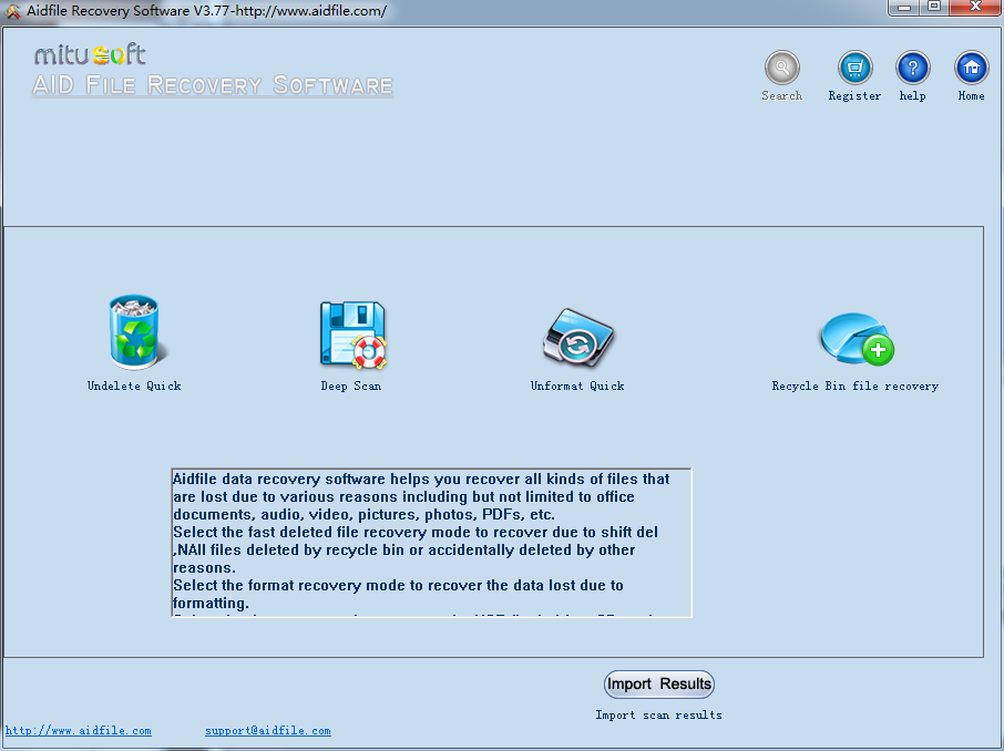 Aidfile Recovery Software官方版是一款操作简单的数据恢复类软件,该软件支持恢复电脑已删除的一些图片、文档、音频、视频等格式的文件,包括RMVB WAV MP3 MP4 MPEG WMV等,并且还支持快速清理回收站功能。