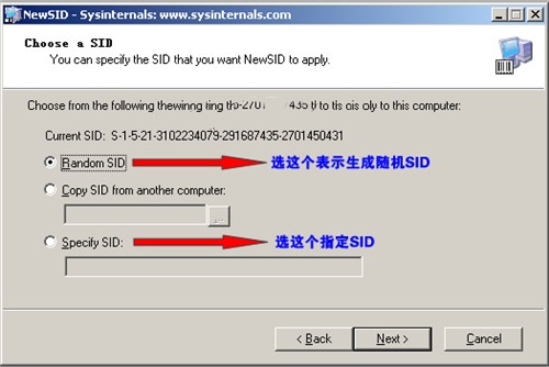 2、正是基于我们这些迫切需求,NewSID可谓是一个完美的解决方案。它提供三种方式来让我们重新生成SID:a.随机产生 b.从其它计算机复制 c.手工输入,以上这三种方式可以满足大多数用户的需求。我们还可以选择是否重新给计算机更名,最后也可以手工指定在SID重定义完成后是否重启计算机。