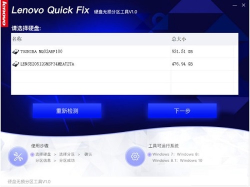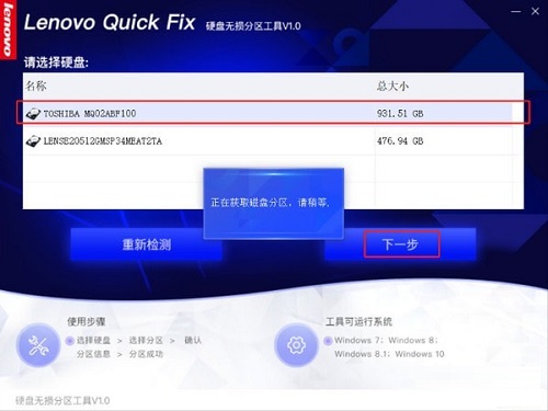 您可以选择要分割的磁盘,点击下一步,软件提示正在获取磁盘分区,本例中选择的是TOSHIBA 931.51GB的硬盘进行演示,如图: