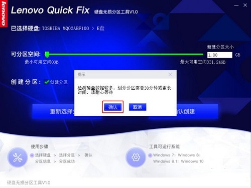 点击上图确认创建,软件提示正在创建分区(注意:如果待分区硬盘上存储的数据比较多,首次运行本软件会需要 较长的时间,请耐心等待执行完成),弹出提示如图: