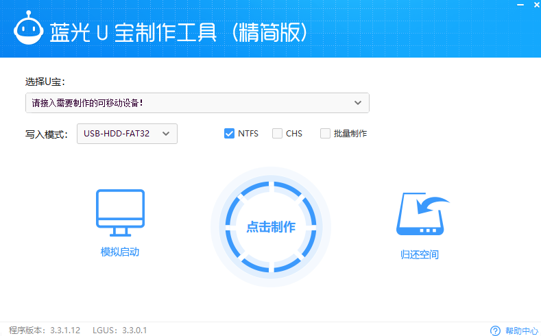 蓝光U宝制作工具官方版是一款非常给力、超实用的u盘制作工具,蓝光U宝制作工具官方版是目前最简单、最好用的u盘启动盘制作工具,蓝光u盘制作工具一键即可将U盘制作成U盘启动盘,真正实现一键u盘装系统,完整版制作的U盘启动盘默认支持BIOS+UEFI双启动,同时默认内置了部分装机工具和软件支持装机工具。
