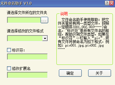 文件命名助手官方版是一款可以帮助用户轻松命名文件的软件,使用帮助:把文件夹里所有同一类型文件,按照一定顺序(001,002,003……)命名,";标识符";是所有文件名的前缀,帮助识别文件类型,如果在“标识符”一栏输入“pic”,所有文件将被命名为如下格式,例如:pic001.jpg,pic002.jpg……