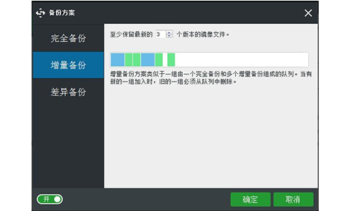 alt=增量备份方案如果您想设置完全备份方案或差异备份方案,免费版是不支持的。您可以给我们留言,就有机会在下一版本使用更多的功能。