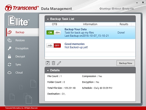 Transcend Elite电脑版是款很优秀且很容易操作的系统文件管理工具,该软件创见产品将提供安全便利的存储平台,让用户更有效率的存储、分享、携带个人数据。Transcend Elite电脑版备份、还原、加密、解密、文件同步等功能,提供丰富的实用工具,可方便进行文件管理,提升电脑实用效率,适用于创见JetFlash闪存盘、StoreJet移动硬盘、可携式固态硬盘。
