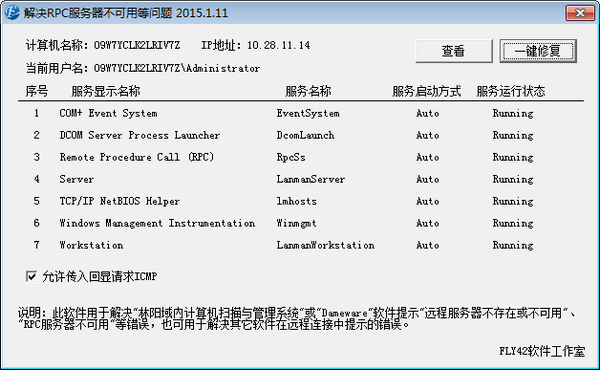 RPC服务器不可用修复工具官方版软件如果你在打印时,或者做其他特别需要的时候电脑出现RPC服务器不可用的话,可以用本工具一键修复,完全不用其他教程说的那样去一个一个查看RPC相关的服务是不是开启,或者服务是不是错误了,只需要此软件就能一目了然服务是不是用起来了,它在软件界面上就列出了所有的RPC相关的服务,而且直接写明了这些服务的状态,还可以勾选是否允许传入回显请求ICMP,还可以解决远程服务器不存在或者不可用的问题。