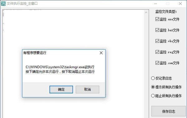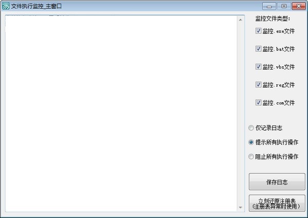 文件执行监控最新版是一款功能相当实用的文件监控软件,文件执行监控最新版操作界面非常简单!软件原理是修改注册表让特定后缀文件用本程序打开,并获取文件路径和启动参数来实现特定后缀文件执行的监控,支持监控exe、bat、vbs、reg、com文件!