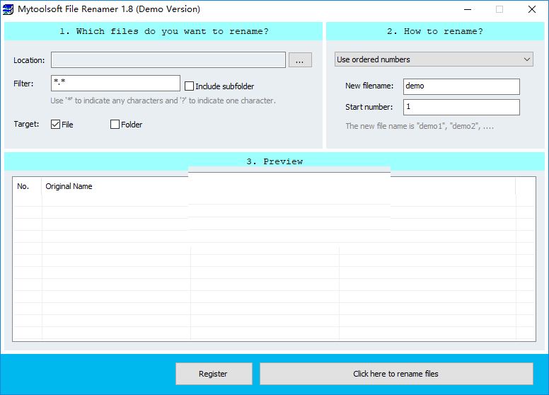 必须指示目标文件夹,指定文件掩码以过滤项目,包括或排除文件夹,以及使用有序编号,添加前缀或后缀,修改扩展名或替换部分文件名来重命名它们。