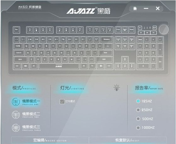 在驱动程序的默认界面,玩家可以调节键盘的报告率,切换情景模式,也就是键盘不同的配置,另外还可对灯光及宏按键进行编辑。