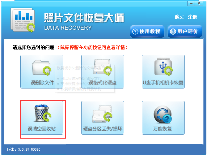 第二步:照片文件恢复软件免费版有六种功能选项以及描述,每一项都可以将用户遇到的问题轻松解决,这里的话建议选择“误清空回收站”选项。