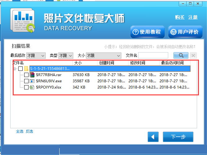 第四步:结束后,在界面左侧找到误删文件对应的格式点击,右侧就是具体的文件信息了,找到需要的勾选上,之后点击“下一步”按钮。