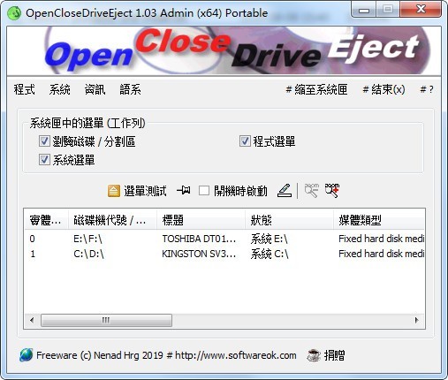 OpenCloseDriveEject最新版是一款界面简洁友好,功能齐全的驱动器弹出关闭软件,OpenCloseDriveEject最新版拥有直观的操作界面,软件支持关闭DVD-, CD,蓝光驱动器弹出USB和外部SSD, SD等,帮助用户更方便的打开关闭弹出的驱动器,满足用户的需要。