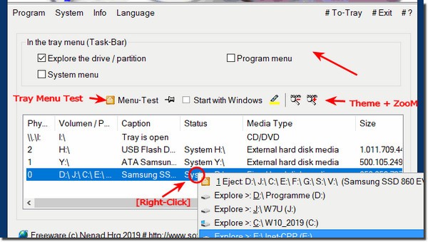 启动该程序。第一次为您提供安全删除USB,SD,...驱动器的默认设置。例如,通过任务栏的“信息”区域直接打开驱动器(Explorer)以打开,关闭和弹出驱动器。但你可以快速定制一切!