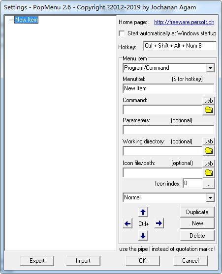 添加第一个软件非常容易,点击设置界面-【command:】右侧的文件夹图标,找到并选择指定程序的exe文件,在【Menutitel:】处手动填写软件名称,点击【ok】,就可以在系统托盘图标上【左击】显示菜单后看到这个软件了。