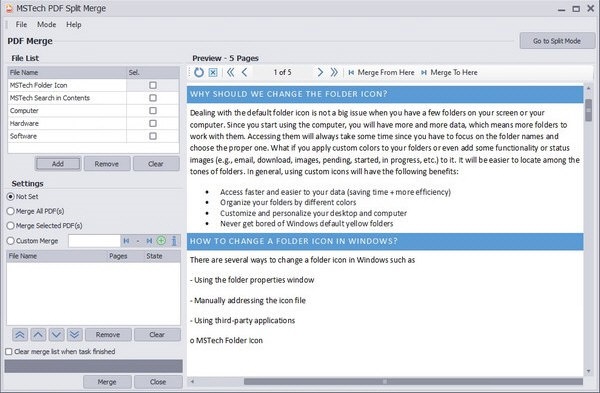 您想将所有选定的PDF合并到一个文件中(简单合并),或从每个PDF中选择一个自定义范围并合并它们。 MSTech PDF Split