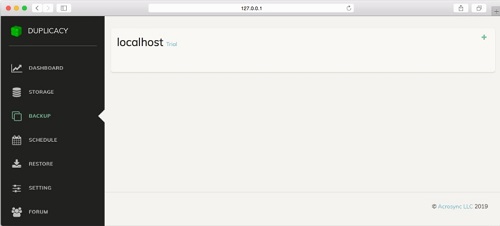 您会注意到localhost标签。这表示Duplicacy Web Edition当前正在运行的本地计算机。旁边有一个试用链接,指示Duplicacy