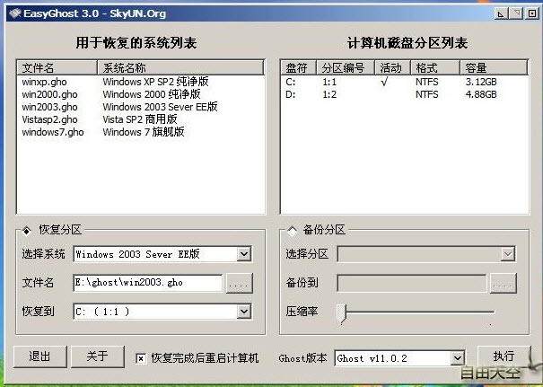 有强大的自定义功能,通过INI文件,可指定您U盘、光盘、硬盘中的多个基于GHO的系统(数量不限)到列表中,使之方便一键恢复指定系统到硬盘,当然,也可在界面中手动选取没有在INI文件中指定的,需要恢复的GHO文件(比如硬盘上以前备好份的GHO文件)。EasyGhost3还可以通过INI文件来指定不同的版本,任意路径的GHOST32.EXE程序,为EasyGhost3调用。恢复与备份调用的GHOST32.EXE可为不同版本的GHOST32(我一般用GHOST8.3用于备份,GHOST11.02用来恢复),备份可设置不同的压缩率。