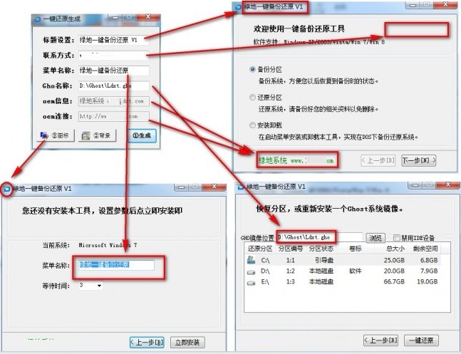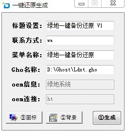 绿地一键还原OEM工具绿色版是一款非常方便实用的系统备份还原工具,绿地一键还原OEM工具绿色版可简单自定义标题,联系方式,菜单名称,GHO名称,OEM信息,OEM链接已经ICO图标和背景图片,支持多硬盘,隐藏分区等备份还原!绿地一键还原OEM工具绿色版支持WIN8/WIN7/VISTA/XP/2003。