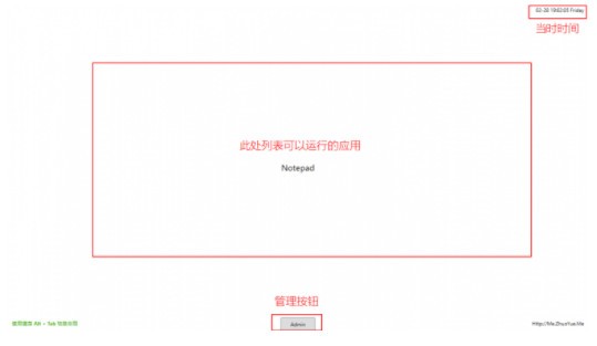 软件的主界面非常简洁:),分为应用App列表区域,那里列表可以运行的应用,时间区域,和一个Admin按钮区域