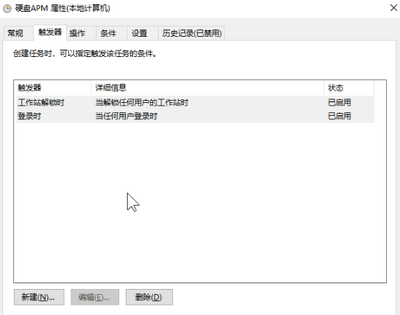 2、触发器:新建2个触发器,一个是“登录时”,一个是“工作站解锁时”