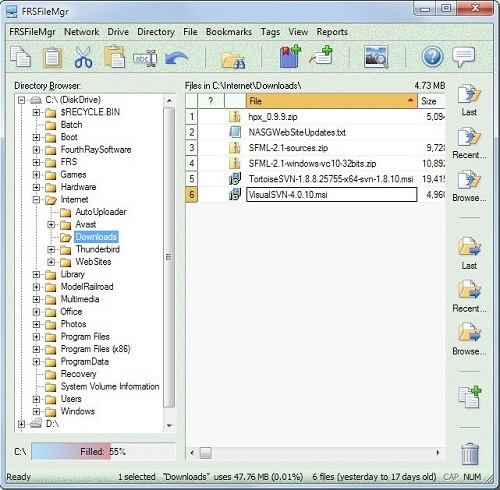 单击其中一个驱动器或目录时,该驱动器或目录中找到的文件列表将显示在右侧。 工具栏按钮和菜单中内置了丰富的与目录和文件交互的功能。