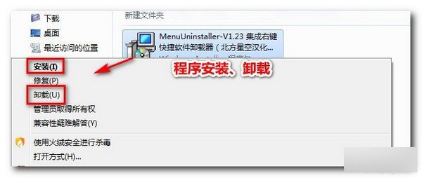 中,卸载软件都要先打开控制面板,然后找到程序,卸载程序,再在密密麻麻的软件列表中找到它,才能完成程序的卸载,这看起来需要好几个步骤才能完成。有了MenuUninstaller这款小软件,两步即可轻松完成。它可以将程序的卸载选项添加到程序快捷方式的右键菜单中,当需要卸载某个程序时,只需要在此程序的快捷方式上点击右键,选择“快捷软件卸载器”即可完成卸载。方便的很!