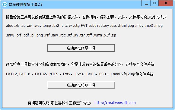 2.硬盘修复工具可以修复硬盘上丢失的数据文件,包括相片,媒体影音,文件,文档等功能。支持的格式,如:.doc .xls .au .avi .wav .bmp .bz2 .c .crw .ctg FAT subdirectory .dsc .html .jpg .mov .mp3 .mpg.mrw .orf .pdf .pl .png .raf .raw .rdc .rtf .sh .tar .tiff .wma .x3f .zip