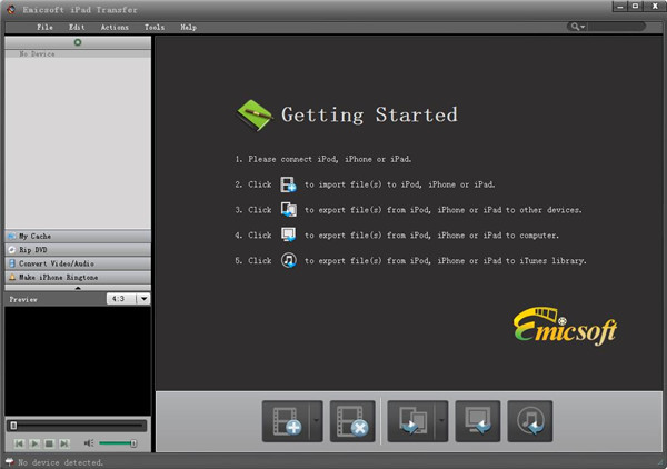 Emicsoft iPad Transfer支持iPhone / iPod touch固件3.1.3.iTunes 9.0.3.并适用于几乎所有Apple播放器,包括iPod,iPod Shuffle,iPod Nano,iPod Touch,iPhone 3G,iPhone 3GS,iPad和iPad 3G。连接iPad后,iPad信息将在界面上列出,包括图片,类型,容量,版本等。