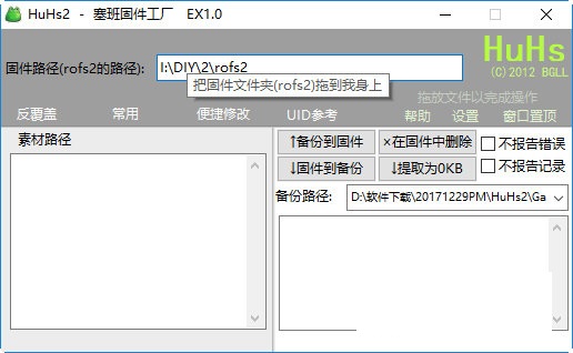 一般做固件能把素材轻松的覆盖进固件文件夹,但是要从固件里把文件提取起来就很麻烦了。制作固件的时候,很多时候要把原固件相应的文件备份出来,免得覆盖后出现什么问题难以还原的素材要覆盖很多文件又在不同的文件夹,手工备份太耗时,而反覆盖功能就能轻松根据素材把固件中相应文件提取出来,要做的仅仅是把素材文件夹拖到窗口再按备份键。
