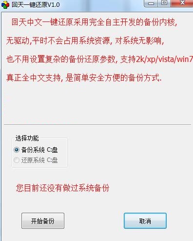 回天一键还原绿色版是款界面简洁大方,功能强劲使用,体积小巧的备份还原系统工具,回天一键还原绿色版上手特别容易,只需用户可以在重装电脑之后,用这个工具对电脑系统进行备份,若下次电脑系统出现问题,可以直接通过该工具快速还原至备份状态。