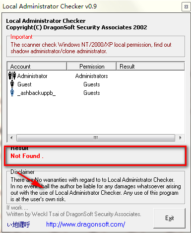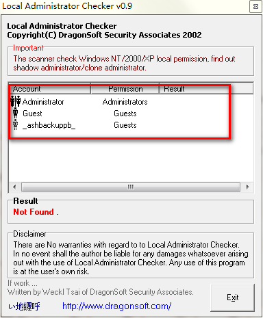 Local Permission Checker是一个检测本地是否有隐藏管理员的工具,专门检测系统中是否存在克隆帐号,用Local