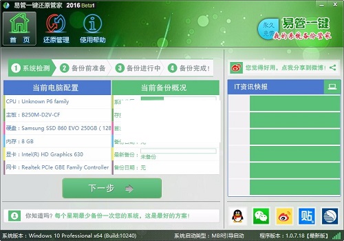 一键备份:打开软件,只需要点击几下“下一步”按钮,便能轻松备份系统,简单易懂,智能省心。
