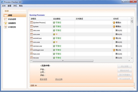 Process Checker Pro电脑版是款针对电脑中系统打造的进程管理软件。Process Checker Pro电脑版可实时查看当前的系统进程,对于进程进行释放、设置优先级和显示细节。还可以对计算机中的进程、启动应用程序、系统服务以及计划任务等进行管理操作。其提供了直观的用户操作界面,可以一键更改进程的优先级。